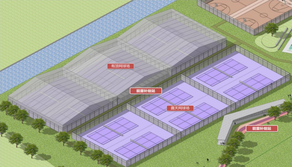 网球场 提供6片室外网球场和5片室内网球场,支持个人预约、团体包场及校园运动会租赁。公园还将开设分级教学体系,提供私教课程和青少年暑期集训营等专业服务。