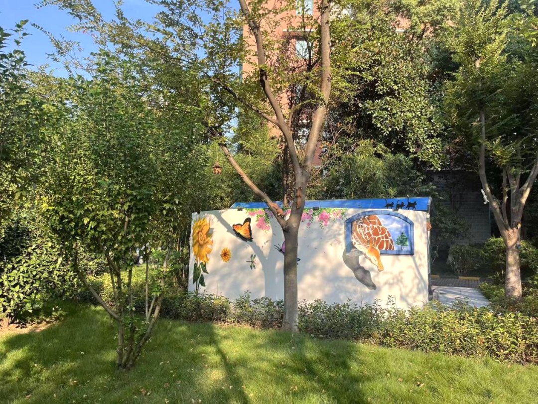 弧形白墙的底部被绿植围绕,绿植外面的树干上还“爬着”两只小松鼠。长颈鹿、蝴蝶、蜻蜓、蔷薇,让人看了忍不住想凑上前去,和它来个近距离“互动”。