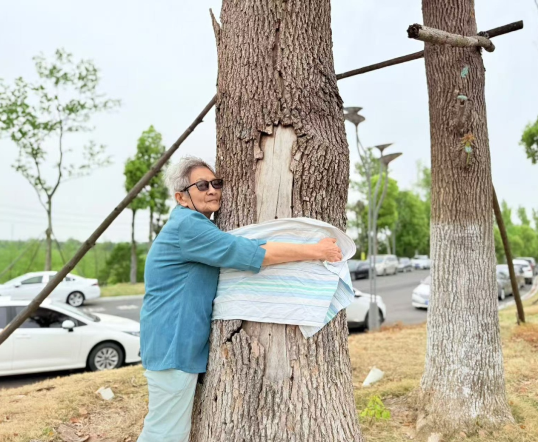 许久没出门的高龄老人被志愿服务队成员带出踏青后,激动地抱住大树合影。